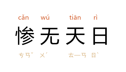 引中国近代史资料丛刊《辛亥革命·人民反清斗争清方档案》:“朕自戊戌八月以来,坐受太后凌辱幽禁,惨无天日。”梁启超 《中国专制政治进化史论》第三章:“以 希腊、罗马 之文明,而其下级社会之民,被虐待者惨无天日,其所沐文明之膏泽者,不过国中一小部分耳。”
