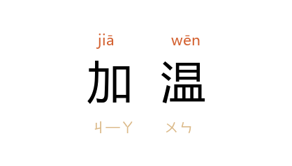 ⒈ 增加温度。又比喻加强某种行动的强度。同“降温”相对。