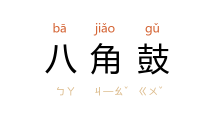 ⒈ 乐器名。为单面蒙皮的八角形小鼓。其中七边各开一长形孔,用铜轴串上两个小铜钹,另一边木框上系有两根长穗。演奏时,左手执鼓,鼓面竖立,右手敲击鼓面。早期用于满族八角鼓戏,现为单弦主要伴奏乐器。