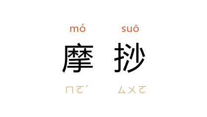 引唐·韩愈〈石鼓歌〉:「牧童敲火牛砺角,谁复著手为摩挲。」《老残游记·第一四回》:「亏得个老王妈在老奶奶身上尽自摩挲,忽然嚷道:『不要紧!心口里滚热的呢。』」