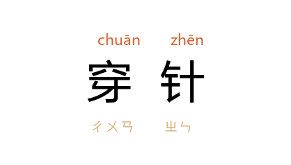 ⒈ 亦作“穿鍼”。 将线穿入针孔。