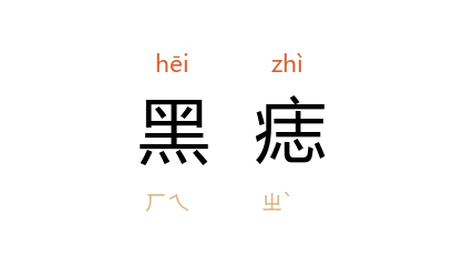 引隋 巢元方 《诸病源候论·瘿瘤等病·黑痣候》:“面及体生黑点为黑痣,亦云黑子。”《醒世姻缘传》第十一回:“説那神道有二尺长鬚,左额角有一块黑痣。”李乔 《欢笑的金沙江》三:“耳朵根脚有一颗黑痣。”