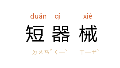 ⒈ 武术中短刀、短枪、剑、钩、鞭、锏等短柄器械的统称。