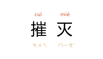 引《三国志·魏志·任峻传》“军国之饶,起於 枣祗 而成於 峻” 裴松之 注引《魏武故事》:“摧灭羣逆,克定天下。”宋 苏辙 《历代论三·荀彧》:“文若 始从 曹公 於 东郡,致其算略以摧灭羣雄。”清 曾国藩 《江宁府学记》:“道士及浮屠弟子,并见摧灭。”《天讨·望帝<四川讨满洲檄>》:“盖虏方以狼暴服四海,侈然自恣,务有以摧灭 炎黄 之遗胤。”
