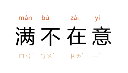引巴金 《复仇集·不幸的人》:“这是一只破旧的提琴,他拿着弓满不在意地拉着。”沙汀 《淘金记》十一:“寡妇的满不在意的态度,无疑是做作的,因为她正为着那些新的花头感到焦灼,预想到一种新的不平的迫近。”曹禺 《日出》第四幕:“竹均,我看得出你也厌恶他们,而你故意装出满不在意的样子,天天自己骗着自己。”