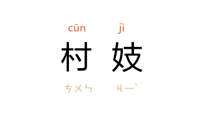 引唐 白居易 《酬思黯相公见过弊居戏赠》诗:“家醖不敢惜,待君来即开。村妓不辞出,恐君囅然咍。”宋 王君玉 《杂纂续·琅璫》:“村妓唱长调--琅璫。”宋 王君玉 《杂纂续·好笑》:“村妓妆梳--好笑。”