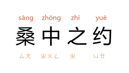 引《诗经·鄘风·桑中》:「云谁之思?美孟姜矣。期我乎桑中,要我乎上宫,送我乎淇之上矣。」《金瓶梅·第二九回》:「只是多了眼光如醉,主桑中之约,眉靥渐生,月下之期难定。」《聊斋志异·卷一一·陈云栖》:「如望为桑中之约,所不能也。」