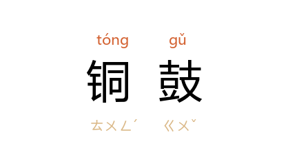 ⒈ 乐器名。用铜铸成的鼓,鼓腔中空无底,两侧有铜环耳,鼓面和鼓身多半有精致的纹饰。此种打击乐器流行于我国广西、广东、云贵、湖南等少数民族地区。