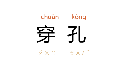 例如:「胃穿孔」、「他将线穿过珠子上的穿孔,做成项链。」