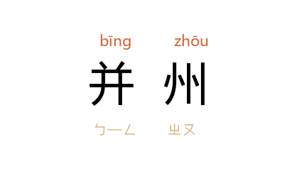 ⒈ 地名。古十二州之一。虞舜以今河北省的旧正定、保定及山西的旧太原、大同等府为并州,周制同虞。汉以今山西省及陕西的旧延安、榆林等府地为并州,北朝至唐则专以今山西省旧太原府为并州。