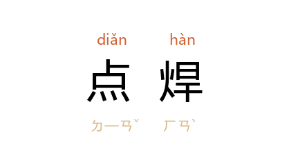 ⒈ 电焊的一种,适用于金属薄板及钢筋等的焊接。把两金属焊件夹持在点焊机的两电极之间,电流通过接触点使其迅速加热,在电极压力作用下造成永久性连接。