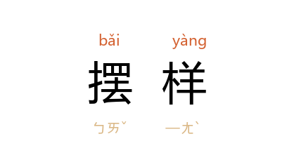 引《天雨花》第二一回:“难道在此空摆样,画图爱宠梦中人。”谢觉哉 《不惑集·团结,谦虚,进步》:“这就告诉我们:共产党和各民主党派长期共存,互相监督,有极大的实际意义,而不是‘摆样’。”