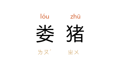 ⒈ 母猪。比喻淫乱的女子。《左传·定公十四年》:“野人歌之曰:'既定尔娄猪,盍归吾艾豭?'”杜预注:“娄猪,求子猪,以喻南子。艾瑕喻宋朝。”南子,卫灵公妃,淫乱,故以喻之。一说谓娄猪为求牡之猪。参阅清王鸣盛《蛾术篇·娄猪》。
