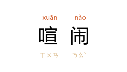 ⒈ 大声吵闹。唐·皮日休〈酒中十咏〉诗一〇首之六:「钩楯跨通衢,喧闹当九市。」也作「喧扰」。