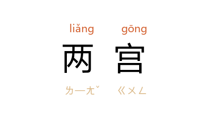 ⒈ 指太后和皇帝或皇帝和皇后。亦指太上皇和皇帝或两后。因其各居一宫,故称两宫。