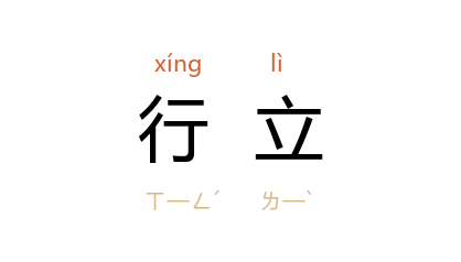 引唐 刘肃 《大唐新语·识量》:“长安 中, 説(张説 )修《三教珠英》,当时学士亦高卑悬隔,至於行立前后,不以品秩为限也。”《旧唐书·宪宗纪上》:“如有朝堂相弔慰及跪拜;待漏行立失序,笑语諠譁;入衙入阁,执笏不端,行立迟慢……每犯夺一月俸。”明 李贽 《荀卿李斯吴公》:“能自立者必有骨也。有骨则可藉以行立;苟无骨,虽百师友左提右挈,其奈之何?”