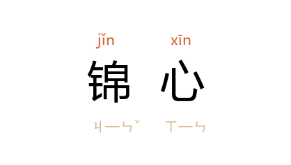 引清 李渔 《闲情偶寄·词曲上·结构》:“有奇事,方有奇文,未有命题不佳,而能出其锦心,扬为綉口者也。”《镜花缘》第九二回:“这句飞的原巧,也难得 春辉姐姐 这副锦心,这张绣口。”清 孙德祖 《<小螺庵病榻忆语>题词·哭舍妹》:“正是 韦 家全盛时,锦心压倒三株树。”