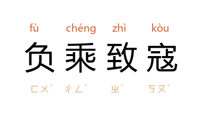 意思是卑贱者背着人家的财物,又坐上大马车显耀,就会招致强盗来抢。后以“负乘致寇”谓居非其位,才不称职,就会招致祸患。 《晋书·张祚传》:“城峻衝生,负乘致寇,惟陛下图之。”