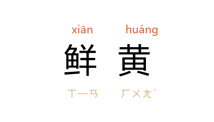 引徐珂 《清稗类钞·植物·库车梨》:“库车 梨,大盈握,色鲜黄,皮薄如纸,味甘如蜜,入口即化。”瞿秋白 《赤都心史》十一:“初春的花草,鲜黄嫩绿。”洪素丽 《一花一叶耐温存》:“﹝美人蕉﹞鲜黄、朱红,原始色彩中最烈性的颜色,像刚健亮眼的村妇,淋它一头西北风,台风怒摇它两日夜,烈日毒辣辣烧它,它仍欣欣长着,油光水亮地美给它自己看。”