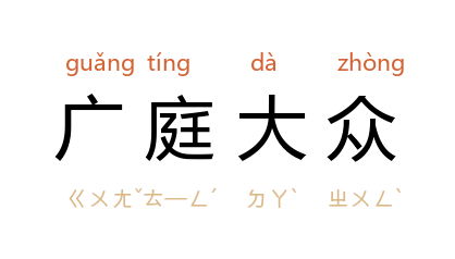 ⒈ 广庭,宽大的厅堂。广庭大众指人数众多的场合。也作「大庭广众」、「广众大庭」。