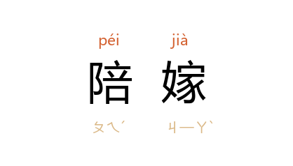 ⒈ 女子出嫁时随带的妆奁或随从的婢女。也作「陪门」、「陪送」、「赔嫁」、「赔赠」、「赔送」。