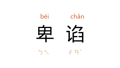 引《史记·五宗世家》:“彭祖 为人巧佞卑諂,足恭而心刻深。”《明史·阉党传·曹钦程》:“钦程 於羣小中尤无耻,日夜走 忠贤 门,卑諂无所不至,同类颇羞称之。”清 袁枚 《随园诗话补遗》卷六:“士风卑諂,太史某恶而刺以诗,中有‘吮痈舐痔’字样。”