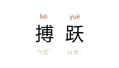 引黄中黄 《沉荩》:“吾同胞之徒见其杀之也,起而叫嚣,而搏跃,而茫然不知其杀之之何以故,则 沉藎 死矣,非 满洲 死之,乃吾同胞推刃以死之也。”王统照 《母亲》:“这时恰相反,微汗,烦躁,在她身上与搏跃的心头阵阵争长。”