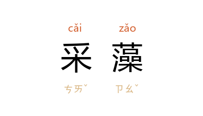 引《诗·召南·采苹》:“于以采藻?于彼行潦。”《〈诗〉序》谓《采苹》是赞美“大夫妻能循法度”的诗,故后世以“采藻”用作颂扬妇德的典故。 《宋史·乐志十四》:“化以妇道,覲于内宫。采苹涧滨,采藻涧中。”