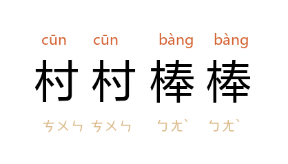 引元 无名氏 《冻苏秦》第三折:“甚勾当,来来往往,张张狂狂,村村棒棒?”元 王世甫 《耍孩儿·贩茶舡》套曲:“看了他村村棒棒,怎和他等等潜潜。”亦省作“村棒棒”。 元 无名氏 《气英布》第三折:“舌剌剌,言十妄九;村棒棒,呼么喝六。”