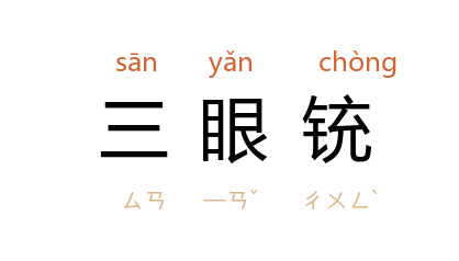 引清 黄六鸿 《福惠全书·保甲·门牌式》:“十家长门前各置一木架,上列长鎗马刀八杆、三眼銃一杆,以备仓卒之用。”毛泽东 《湖南农民运动考察报告·十四件大事》:“二都 禁放鞭炮和三眼铳。”李準 《三眼铳》:“三眼铳是象土枪一类的火器,一根木头把子上装着三个铁筒筒,筒子下边都有个小孔眼,筒子里装着火药,孔眼里纫上火引。”