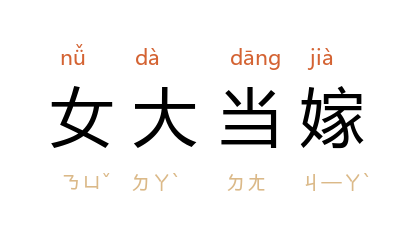 引《水浒后传》第三九回:“男大当婚,女大当嫁,理之当然。兄长之举,真为两全其美。”越剧《梁山伯与祝英台》第七场:“英台,为父也何尝捨得你离开膝下,怎奈女大当嫁。”