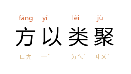 引《易·繫辞上》:“方以类聚,物以羣分,吉凶生矣。”孔颖达 疏:“方谓法术性行,以类共聚。”晋 皇甫谧 《三都赋》序:“土有常产,俗有旧风;方以类聚,物以羣分。”明 方孝孺 《王进德传》:“古所称方以类聚者, 进德 与 琟 之谓耶!”聂绀弩 《论通天教主》:“方以类聚,物以群分,用 王安石 的说法,就是‘畜生出其门’,此人之所以不至也!”