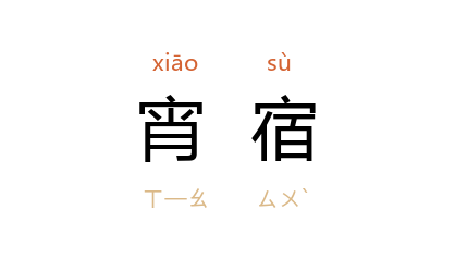 引元 无名氏 《硃砂担》第一折:“天色晚了也,我在这店肆中觅个宵宿咱。”元 无名氏 《黄花峪》第四折:“天色已晚,特来借一箇宵宿。”