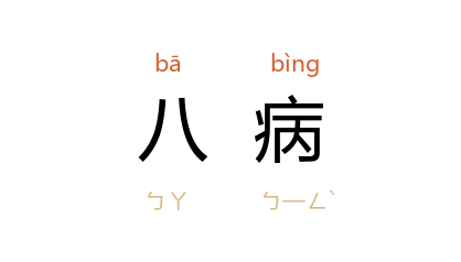 ⒈ 谓作诗在声律上应当避忌的八种弊病。 南 齐 永明 中 沉约 等倡声病说,至 唐 始有八病的名目, 宋 人更加以发挥。八病为:平头、上尾、蜂腰、鹤膝、大韵、小韵、旁纽、正纽。平头指五言诗第一字、第二字不得与第六字、第七字同声(同平、上、去、入)。一说,句首二字不得并是平声。上尾指第五字不得与第十字同声(连韵者可不论)。蜂腰指五言诗第二字不得与第五字同声,言两头粗,中间细,有似蜂腰。鹤膝指第五字不得与第十五字同声,言两头细,中间粗,有似鹤膝(近人从 宋 蔡宽夫 说,以为五字中首尾皆浊音而中一字清者为蜂腰,首尾皆清音而中一字浊者为鹤膝)。大韵指五言诗如以“新”为韵,上九字中不得更著“人”、“津”、“邻”、“身”、“陈”等字(即与韵相犯)。小韵指除韵以外而有迭相犯者(即九字之间互犯)。旁纽一名大纽,即五字句中有“月”字,不得更著“鱼”、“元”、“阮”、“愿”等与“月”字同声纽的字。正纽一名小纽,即以“壬”、“衽”、“任”、“入”为一纽,五言一句中已有“壬”字,不得更著“衽”、“任”、“入”字,致犯四声相纽之病,八病说原为研讨声韵和协变化,对律诗的形成起了一定的作用,其弊病在于刻意追求形式,雕琢繁琐,反而束缚了诗歌内容的表达。参阅 宋 梅尧臣 《续金针诗格》、 清 纪昀 《沉氏四声考》下。