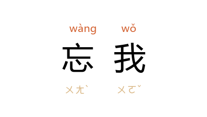 ⒈ 原指超乎自我。语本晋·郭象·注:「吾丧我,我自忘矣,天下有何物足识哉!」后亦指因公而忘私。