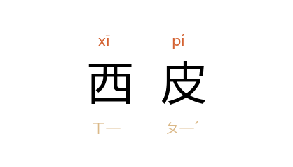 ⒉ 漆器的异称。 宋 曾三异 《因话录》谓髹器称西皮者,乃西方马鞯因马镫磨擦,有凹处粲然成文,遂以髹器仿为之。 明 都穆 《听雨纪谈》对此说有所辨正,以为髹器当作“犀毗”。毗者脐也。犀牛脐旁多文,坐卧磨砺,色甚光明。西域人割取以为腰带饰。髹器仿为之,遂袭其名。但据近人研究,谓自 宋 代以后,人们开始用“犀毗”借喻黑色髹器,当时又称“犀皮”或“西皮”。一说,黑色雕漆多半由 中国 西部传来,故称“西皮”。