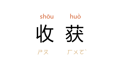 ⒉ 所获得的成果、成绩、心得等。唐·白居易〈与希朝诏〉:「况杀伤既重,收获颇多。」也作「收获」。