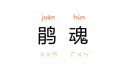 ⒈ 相传古代 蜀 帝 杜宇 让位 鳖灵 自逃,后欲复位不得而死,魂化为鹃,悲啼不止,乃至血出,人称冤鸟。故以“鹃魂”指冤魂。