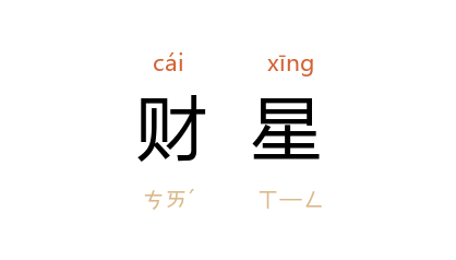 引明 沉君庸 《簪花髻》:“兀的那 杨升庵,你昨夜做好梦也,今日财星进门哩!”清 蒲松龄 《聊斋志异·齐天大圣》:“适所会财星,赐利十二分,何须他求。”昆曲《十五贯·鼠祸》:“财星高照,眉开眼笑。”