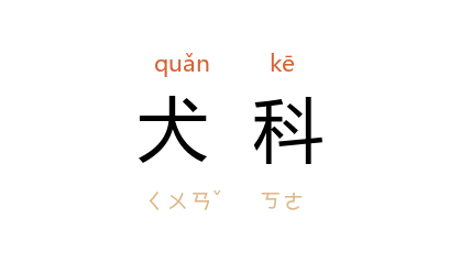 ⒈ 哺乳纲食肉目的一科。颜面长;鼻腔大,密布嗅神经,故嗅觉灵敏;臼齿较多,裂齿发达;四肢长,前足五趾,后足四趾,爪不能伸缩。几乎遍布全世界。如犬、狼、狐、貉等。