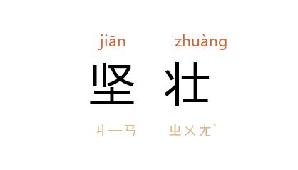 引宋 苏辙 《论黄河软堰札子一首》:“若使所塞坚壮不可动摇,则涨水咽怒必为上流之患。”宋 周密 《癸辛杂识别集·汴梁杂事》:“汴 之外城, 周 世宗 时开筑, 神宗 又展拓,其高际天,坚壮雄伟。”《辽史·耶律铎轸传》:“十七年,城西边,命 鐸軫 相地及造战舰,因成楼船百三十艘,上置兵,下立马,规制坚壮。”