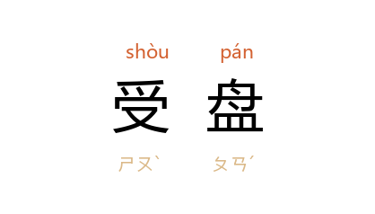 ⒈ “推盘”的对称。也叫“接盘”。旧中国商业中商人购买别人商店的全部财产(如设备、用具、货物等),继续经营,称受盘。
