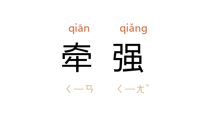 ⒈ 勉强。唐·皇甫冉〈同李司直诸公暑夜南余馆〉诗:「微官朝复夕,牵强亦何心。」也作「牵彊」。