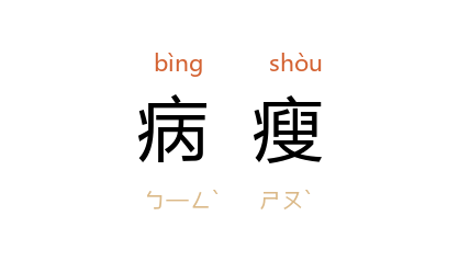引唐 白居易 《新秋病起》诗:“病瘦形如鹤,愁焦鬢似蓬。”宋 苏轼 《王晋卿作烟江迭嶂图仆赋诗十四韵晋卿和之语特奇丽因复次韵》:“却因病瘦出奇骨,盐车之厄寧非天。”宋 邵伯温 《闻见前录》卷十八:“后夫人病瘦,医者既投药,又梦寝堂门之左右木瓜二株,右者已枯,因为大父言,大父遽取药覆之。”