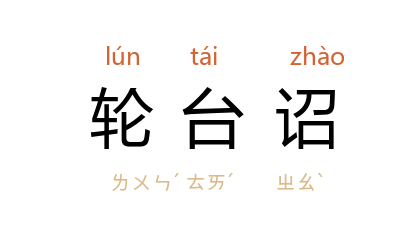 ⒈ 汉武帝 一生,致力开拓 西域,国力大损。至晚年深悔之,遂弃 轮台 之地,并下诏罪己,谓之“轮臺詔”。事见《汉书·西域传赞》。