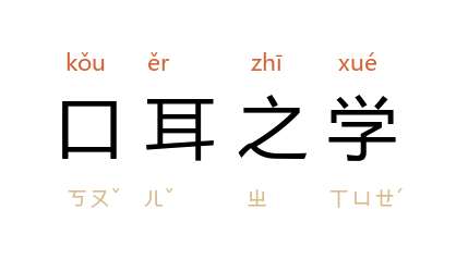 ⒈ 耳朵听进去后,只在嘴上说说,而无实学。语本后比喻从道听涂说中得来的片面知识。宋·陆游〈跋柳书苏夫人墓志〉:「今诸家徒欲以口耳之学揣摩得之,可乎?」亦可喻仅以口头传授而不见于文字的学识。