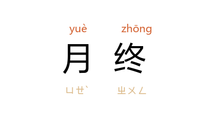 引《周礼·天官·小宰》:“月终则以官府之叙受羣吏之要。”《新唐书·百官志一》:“凡献食、进口味,不杀犊。尚食有猝须别索,必奏覆,月终而会之。”《水浒传》第五七回:“不如写一封书,使小嘍囉去那里求救。若解得危难,拚得投托他大寨,月终纳他些进奉也好。”