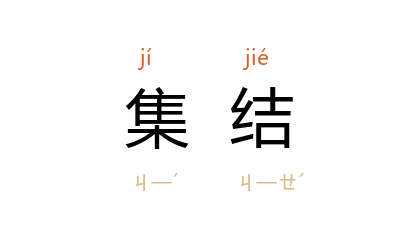 ⒈ 聚集、集合。多指集合兵力于一指定地区,借以准备更进一步的行动。