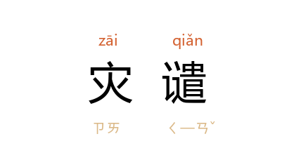 引《后汉书·翟酺传》:“自去年已来,灾谴频数。地坼天崩,高岸为谷。”《三国志·魏志·杨阜传》:“政有不当,则见灾谴。”晋 郭璞 《皇孙生请布泽疏》:“宜於此时,崇恩布泽,则火气潜消,灾谴不生矣。”《晋书·姚兴载记下》:“灾谴之来,咎在元首。”