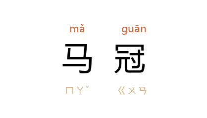 ⒈ 古代系在马额上的装饰品。呈扇形,为一兽形面具,粗眉圆眼,大鼻宽口,边缘有很多穿孔用来系带子。现在出土的马冠大多属西周时代。